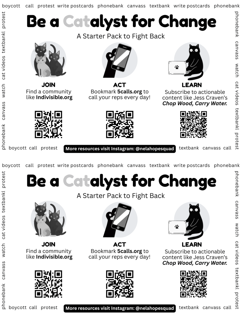 *Create Your Own Resource Page: Develop an action step flyer for your group members/others. For example, here are two great pieces created by Indivisible groups. The top one is from Indivisible Rosedale Huddle and the second is by the NELA Hope Squad. You can use something similar or adapt to make your own. (Thanks to both groups for sharing their material.)