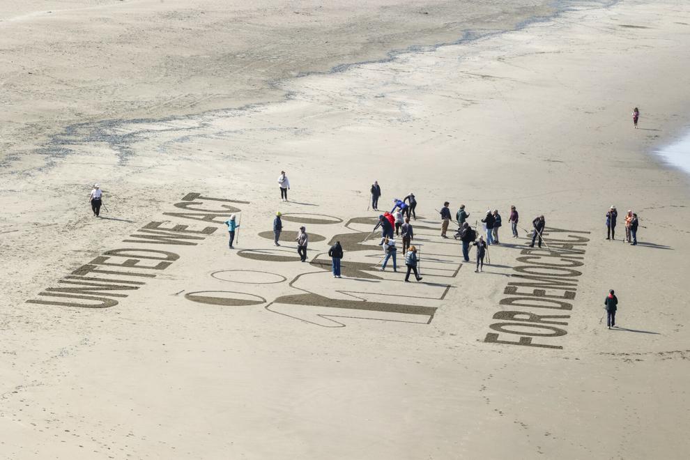 *Create A Visible Display—A unique display can generate attention and support. Besides the basic rally sign and billboards/airplane banners (which are expensive), consider other options that make a powerful statement (but aren’t threatening or profane). For example, here volunteers work on the sand art message “United We Act For Democracy” by artist Andres Amador on Ocean Beach in San Francisco on Friday, May 16, 2025. (San Francisco Examiner)